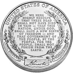 The obverse of the Abraham Lincoln Bicentennial commemorative dollar, designed by Justin Kunz, depicts an image of President Lincoln, which was inspired by Daniel Chester French's famous sculpture of the President that sits inside the Lincoln Memorial in Washington. The reverse, designed by Phebe Hemphill, features the last 43 words of the Gettysburg Address.[4]