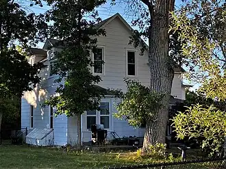 It is an L-shaped two-story building with a gable-front and wing, and an intersecting gable roof. It was originally covered with wood clapboard, but front and sides were covered with asbestos shingle siding in 1942. It has boxed eaves, with full gable returns and raking molding. It occupies a corner lot; its gable front faces southeast onto W. Montana St.; its southwest side is along 7th Ave. The southwest side has two dormers breaking the roofline, and another dormer faces southeast from the wing which extends to the northeast. A c. 1945 wood-frame garage is directly behind the house, relative to the street corner, connecting at the north corner of the house.[2][note 1]