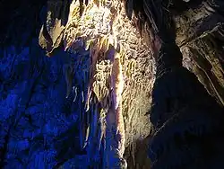 Abukuma-dō (あぶくま洞 - Abukuma Cave) is a limestone cave located in Fukushima Prefecture, Japan. [1]The cave was discovered on August 15, 1969, northeast of the city of Tamura and was originally named Kamayama Shonyu-do (釜山鍾乳洞). It was designated a natural heritage of the town on February 7, 1971, and renamed Abukuma-dō on June 1,1973.[2] Visitors can traverse a 600-metre-long path inside the cave as well as a 120-metre-long exploration course to view the stalactites and stalagmites. Each stalactite has taken more than eighty million years to form.[3] Beyond the public areas lie about 2,500 metres of cave that are not open to the public. Nearby Abukuma Cave is the smaller Irimizu Shonyu-do (入水鍾乳洞 - Irimizu Limestone Cave), discovered in 1927. Irimizu Limestone Cave was designated a National Natural Treasure on December 28, 1934.[4] The temperature inside Abukuma-dō is approximately 15 °C and the humidity is above 90%.