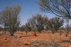Mulga scrub is distinctive and widespread, with the Mulga Lands of eastern Australia defined as a specific bioregion. The dominant species in these woodlands is mulga, with poplar box (Eucalyptus populnea) forming an increasingly important codominant in the eastern districts.[15][16] The extent of ground cover in mulga woodlands varies with canopy density of the overstorey, becoming almost nonexistent in extremely dense stands. In more open stands, the herbaceous layer consists of wire grasses (Aristida spp.), mulga oats (Monocather sp.), mulga mitchell (Thyridolepis sp.), wanderrie (Eriachne spp.), finger grasses (Digitaria spp.) and love grasses (Eragrostis spp.). Various other woody species are also significant in mulga woodlands, particularly hop bushes (Dodonaea spp.), Eremophila and cassia (Senna spp.).[14][16]