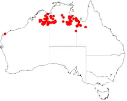 This species of wattle is native to an area of the Kimberley region of Western Australia, to the Northern Territory and north western Queensland north of around 20° in latitude,[3] but is considered to be quite rare in Queensland.[9] It is often in found around areas of shale, but also will grow in lateritic and sandy soils.[2]