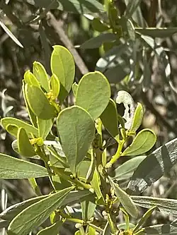 Acacia argyraea is a shrub or tree with smooth grey to brown bark, that typically grows to a height of up to 3 m (9.8 ft) and is covered with silvery, silky hairs. Its branchlets are two- or three-angled, especially near their ends. The phyllodes are narrowly elliptical to elliptical, 40–80 mm (1.6–3.1 in) long, 15–35 mm (0.59–1.38 in) wide and leathery with three to six prominent veins. The flowers are pale yellow, and borne in single spikes in axils 10–25 mm (0.39–0.98 in) long. Flowering occurs in July and August, and the fruit is a flat, linear to lance-shaped pod 60–85 mm (2.4–3.3 in) long, and contains brown, oblong to elliptic seeds 4–6.5 mm (0.16–0.26 in) long.[2][3][4][5][6]