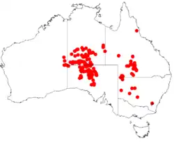 This species of wattle is widespread in arid central Australia and is found in the southern Northern Territory[9] the Central Ranges, Great Sandy Desert, Great Victoria Desert bioregions of Western Australia,[4] central-western South Australia,[10] near Tibooburra in the far north-west of New South Wales[2] with scattered populations in south-west Queensland. It grows along ephemeral watercourses and on degraded sand dunes as part of low open woodland and tall open shrubland communities. It grows well in heavy calcareous soils usually over limestone and is often associated with Acacia aneura.[7]