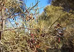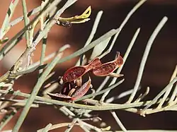Acacia calcicola is rounded shrub or straggly tree that typically grows to a height of 1.5 to 6 metres (5 to 20 ft) and often has multiple stems at the base and a spreading bushy crown. The phyllodes are variably shaped, narrowly linear to linear or very narrowly elliptic, straight to slightly curved, 50–140 mm (2.0–5.5 in) long and 1–10 mm (0.039–0.394 in) wide. The phyllodes have a more or less hooked end and are leathery and densely covered with soft hairs pressed against the surface. The flower are borne in 2 to 5 spherical heads in racemes 3–15 mm (0.12–0.59 in) long on a peduncle 2–8 mm (0.079–0.315 in) long. Each head is 3–4 mm (0.12–0.16 in) in diameter and has 30 to 60 golden yellow flowers. Flowering occurs from August to December and the pods are up to 120 mm (4.7 in) long, 4–8 mm (0.16–0.31 in) wide, wrinkled and woody, resembling a string of beads.[4] The seeds are dull brown, elliptic and 6 to 8 mm (0.24 to 0.31 in) long with a club-shaped aril.[2][5][6][7]