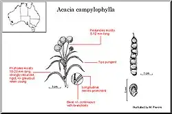 - ^ a b Cowan, Richard S.; Maslin, Bruce R. Kodela, Phillip G. (ed.). "Acacia campylophylla". Flora of Australia. Australian Biological Resources Study, Department of Climate Change, Energy, the Environment and Water: Canberra. Retrieved 8 June 2025.