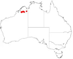 This species of wattle is found around Mount Bell and Scott Gorge in the Central Kimberley bioregion of Western Australia, often growing on steep rocky slopes or along creek lines in clay soils over granite, under Livistona palms.[3][4][6]