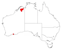 This species of wattle grows in eucalypt savanna with annual sorghum and sandy alluvium near watercourses on the Gibb River and Karungie stations in the Central Kimberley, Northern Kimberley and Victoria Bonaparte bioregions of northern Western Australia.[3][4][8]