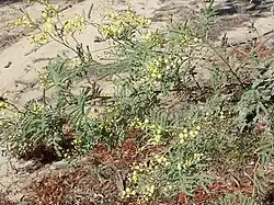 The shrub or tree has a spreading to erect habit and typically grows to height of 1.5 to 7 m (4 ft 11 in to 23 ft 0 in) and has smooth grey-brown to green coloured bark. It has angled to terete ridged branchlets with tiny yellow to whitish hairs. The pinnate leaves have ten to twelve pairs of pinnae that are 0.7 to 6.5 cm (0.3 to 3 in) in length with 7 to 45 pairs of pinnules that have an oblong to linear shape and have a length of 1.5 to 12 mm (0.06 to 0.5 in) and a width of 0.4 to 1.3 mm (0.02 to 0.05 in). It blooms throughout the year producing inflorescences situated in the terminal and axillary racemes and panicles. The spherical flower heads have a diameter of 3 to 5.5 mm (0.12 to 0.22 in) and contain 15 to 30 cream-coloured to pale yellow or occasionally yellow flowers. The seed pods that form after flowering are flat and straight to curved and constricted between seeds. The leathery pods are 3.5 to 18 cm (1.4 to 7.1 in) in length and 5.5 to 11 mm (0.2 to 0.4 in) in width.[1]