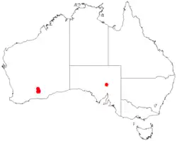 It is native to a small area in the Goldfields-Esperance region of Western Australia in a small area in the Dundas where it is found on low rocky hills growing in rocky sandy-loam-clay soils.[1] Only two populations of the shrub are known both of which are located about 25 km (16 mi) to the north of Norseman in mallee or shrubland communities.[2]