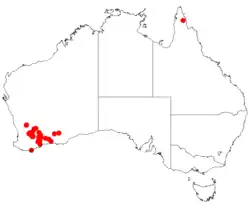 It is native to an area in the Wheatbelt and Goldfields-Esperance regions of Western Australia where it is commonly situated on undulating plains growing sandy or clay-loam soils.[2] It has a scattered distribution from around Cadoux in the north west down to around Dunn Swamp about 100 km (62 mi) north of Raventhorpe in the south east.[3]
