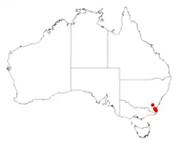 It has a limited range in south eastern New South Wales from around Tathra and Bega in the north and extending down the Great Dividing Range to around Bemboka, the Yowrie River and Tuross River regions in the south. It is often situated on exposed rocky outcrops, slopes and ridges growing in thin soils over sandstone, conglomerate or granite as a part of scrub, heath or open dry sclerophyll forest communities.[2]