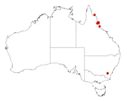 It is native to a small area in northern Queensland just south east of Cairns where it is a part of rainforest communities.[5] It is found in only a few localities that range in altitude from sea level up to 400 m (1,300 ft) in well developed upland and lowland rain forest. It grows well in disturbed areas and is a component of rain forest regrowth.[4]