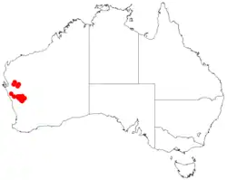 It is native to an area in the Mid West region of Western Australia[2] from around Mullewa in the west through to around Yalgoo in the east and to around Karara Station to the north of Morawa in the south. It is often situated on plains or low rises growing in loam or loamy clay soils as a part of Eucalyptus woodland communities or Melaleuca shrubland communities.[1]