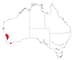 It is native to an area along the west coast in the Wheatbelt and Peel regions of Western Australia where they are often situated in lateritic soils.[1] The bulk of the population is found from around Mount Lesueur in the north down to around Kalamunda in the south and also from around Serpentine and Watheroo where it is found in loamy soils in as a part of Eucalyptus wandoo woodlands or loamy gravelly soils in low heath communities.[2]