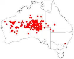 The plant grows in a variety of environments across Australia, although in Western Australia it is much more restricted and will only grow in sandy or clay soils and is often found on stony plains and in clay-pans[3] in and around drainage lines or alluvial or stony to hard-pan plains where it grows in gilgai clay or heavy loam soils as a part of low woodland communities that can feature Acacia aneura, Acacia catenulata and Acacia distans as well as species of Eremophila.[1]