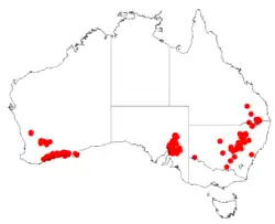 The shrub it has a discontinuous distribution. It is native to an area in the Wheatbelt, Great Southern and Goldfields-Esperance regions of Western Australia[2] from Israelite Bay in the east to Boxwood Hill in the south west and Wubin in the north west. It is also found throughout the Mount Lofty Range and Flinders Range in South Australia from around Angepena Station to around Burra. It is also found in Queensland and New South Wales in the eastern states from between Cobar and Temora in the south to around Tara and Warwick. It is often found as a growing in rocky shallow as a part of open shrubland or woodland communities.[3]