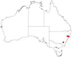 It has a limited distribution in north eastern New South Wales where it found on serpentinite ridges between Mount George and Bralga Tops[2] and upper areas of the Barnard River where it is situated in rugged parts of the Great Dividing Range.[1]