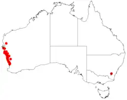 It is native to an area on the west coast of Western Australia where it occurs on coastal limestone usually adjacent to sand dunes between Fremantle in the south and Shark Bay in the north.[2] It grows in sandy soils as a part of scrub, thicket, mallee or low forest communities.[1]