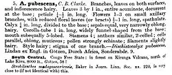 Flower are arranged in racemoid head that are 3 cm long, peduncle is 0.5–23 mm long, winged, and vary from being hairy to hairless. The bracts of the flower are purplish, pedicles are 1 mm long. The Calyx is 5–10 mm long and can be found in different variety. Most of the flowers are usually white-hairy pubescent, the lobes are linear-lanceolate, and vary from acute to obtuse. The corolla is white with purple lines near the racemoid head. Also, the corolla is pubescent with glossy hairs. The stamen is 8–15 mm long, and can be acute or bifid at the apex. Lastly, the A. Pubescens have four ovules, which enables them produce maximum amount of seeds.