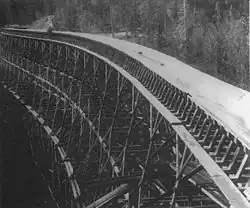 In order to move logs from the plateau above the Lower river, Adams River Lumber constructed several flumes. The flumes were elevated wooden troughs filled with water that floated logs down to the valley bottom. The largest of these was at Bear Creek. It incorporated trestles up to 25 metres (82 ft) high and was capable of moving 3,000,000 metres (9,800,000 ft) of logs per month.[7] It was the largest flume in North America at its peak.[4] The structures were dismantled after the areas became logged out.[7] Although logging continues in the region, the Adams is no longer used for log transport.[9]