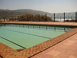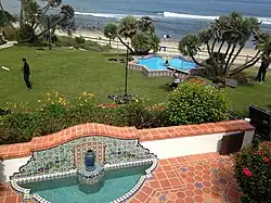 Another striking feature of the house is the tiled swimming pool set into the sand that was equipped with a special filtering and heating apparatus that permitted the pool to be filled with either salt or fresh water.[7] The Los Angeles Times in 1930 noted that the unusual features made the "plunge one of the finest in the southland."[7]