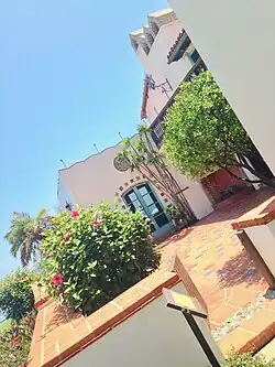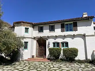 The two-story, ten-room Adamson House was designed by Stiles O. Clements and built of steel-reinforced concrete.[6] Completed in 1930, Stiles called the house an outstanding example of modified Mediterranean Revival-style architecture.[7] Architectural historians refer to the style as a synthesis of Spanish Colonial Revival and Moorish Revival architecture. The interior features red tile floors, lancet windows, tile roofs, wood beams and molded walls. [8] The house features teak woodworking, fireplaces in several interior and outdoor patio rooms, handpainted ceilings, lead-framed bottle glass windows, and "wrought-iron filigrees fitting over the windows like intricate jewelry."[2][9] The main floor is dominated by a large living room with windows on three sides. The room is still furnished as it was when the Adamsons lived there, including the large radio on which the family received news of the attack on Pearl Harbor. Other rooms on the main floor include a guest bedroom with a bathroom that is tiled literally from floor to ceiling, a dining room with an old convent table overlooking the ocean, a kitchen with an early version of a dishwasher and a colorful tiled clock, and the main entrance with its imposing wood door and tiled entrance table. The house also features an elevator system.