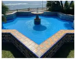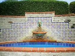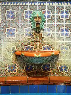 One of the home's most popular examples of tilework is a 60-foot (18 m) imitation Persian carpet made of tile, including small pieces designed to look like rug fringes.[2] In the exterior of the house, the colorfully tiled Neptune Fountain, Peacock Fountain and Star Fountain are among the home's most photographed examples of tilework. Nearby, there is also an elaborately tiled outdoor tub used by the Adamsons to bathe their dogs.[2] The bathhouse and swimming pool are also covered with Malibu tile, and the dressing rooms have tiled showers with decorative motifs.[2] The house has been called a "museum of tile"[9] and the "Taj Mahal of Tile".[12] The Malibu Potteries only operated for six years from 1926 to 1932,[10][12] and the Adamson House has many of the potteries' most significant remaining works.[13]