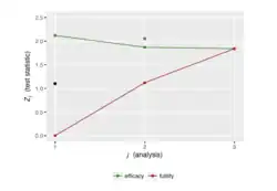 - Interim looks to assess stopping the trial early either for success, futility or harm
