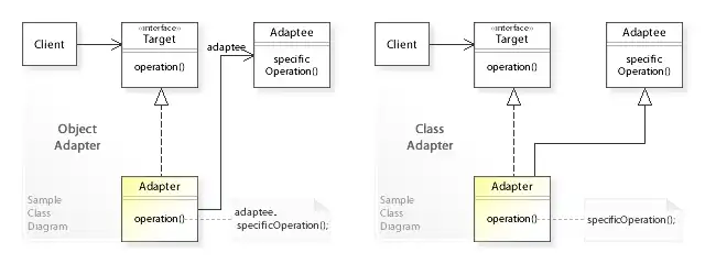• The object adapter way implements the target interface by delegating to an adaptee object at run-time (adaptee.specificOperation()).