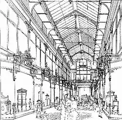 The elevations, similar on both Rundle and Grenfell streets, were of Italian style; the lower half dominated by the glass shop-fronts and arcade entrances, protected by verandahs supported by decorative iron columns, with a square balcony at the centre, behind which was an octagonal tower and dome, bearing an Australian coat-of-arms (not the coat of arms — Federation was still 15 years away, but the design used bore a strong resemblance to that ultimately chosen).[9] Inside, the ceiling featured wide cornices constructed of moulded galvanized iron, and the upper cornices being surmounted by a deep cove finished with panelled soffit, returning down the cove and across the ceiling, which is broken up into a series of deeply recessed panelled bays, glazed with diapered and coloured glass. Additional sunlight was supplied by circular bullseye lights in alternate bays of the cove. Special attention was devoted to the lighting and ventilation, the latter provided by air tunnels and shafts connected with the towers.