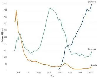 - ^ Table 1. Sexually Transmitted Diseases — Reported Cases and Rates of Reported Cases per 100,000 Population, United States, 1941–2016, Centers for Disease Control and Prevention, September 26, 2017