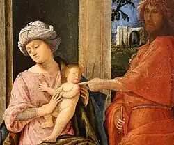 If the man wearing red with a rod is John the Baptist, then his depicted age is anachronistic, as John was regarded as only a few years older than Jesus, but much less so than for Isaiah. An earlier Adoration of the Christ Child by Bramantino (c. 1485), now in the Pinacoteca Ambrosiana in Milan, contains an even more eclectic group of figures: several wingless angels playing instruments, three medieval saints, the Tiburtine Sibyl at far right, and at the far left a figure variously identified as the pagan god Apollo (favoured by the museum), the Emperor Augustus or the poet Virgil. The sibyl, Augustus and Virgil can all be related to medieval legends concerning prophecies of the coming of Christ; an ageing Apollo, if he is the figure, appears resigned to the new dispensation.[9] One legend appears in the Golden Legend (1.40); a sibyl prophesies to Augustus that his Temple of Peace in Rome would crumble the day a virgin gave birth.[10]