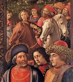 Ghirlandaio painted in the left foreground a series of characters, among which are the donor (dressing in black), and the artist himself, who looks towards the viewer. On the right, in the Magi procession, are three richly donned men, which have been identified as major members of the Arte della Seta (Guild of the Silk Workers), the main financial backer of the Hospital. Above them, the procession continues in the far background, passing under an arch (with the date, MCCCCLXXXVIII, or 1488) another possible symbol of the fall of the transition between paganism and Christianity. The five horses were painted starting from only two cartoons, adding some small variants in the heads. The same sector of the background depicts the annunciation to the shepherds by a flying angel. Finally, painted above a lake landscape with ships among hills and mountains, a layman and a clerk observe the scene: they symbolize the main institutions backing the orphanage.