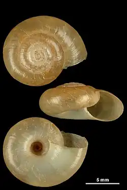 (Original description in Latin) The shell is slightly convex and depressed with a broad umbilicus and barely noticeable striations. It is convex above and compressed below. The spire is slightly convex with a minute, obtuse apex. There are five slightly convex and depressed whorls, with the first being minute and the others growing more rapidly. They are separated by an impressed suture. The body whorl is larger, depressed-rounded, and the base is somewhat widened at the aperture, which is hardly tectiform and is not descending. The aperture has a lunate shape and is ovate-oblong and scarcely compressed. The peristome is straight, simple and acute. [2]