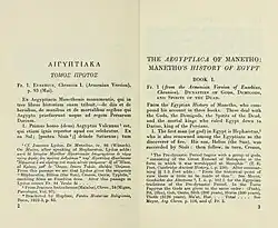 3. ^ In the study of lost literary works, "literary fragment" denotes a surviving portion of text from an otherwise lost or incomplete work. The fragments can occur physically as remnants of papyrus pieces or inscriptions, or indirectly through quotations, allusions, or translations found within extant texts of other, later, authors. In the instance of the Aegyptiaca, the literary fragments are indirect.