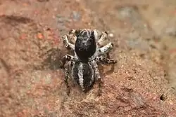 Aelurillus brutus is a medium-sized spider with distinctive features. It has a body that is divided into two parts, a cephalothorax and an abdomen.[8] The female has a dark brown, nearly black, carapace, the hard upper part of the cephalothorax, which is typically 3.2 mm (0.13 in) in length and 2 mm (0.079 in) in width. It has a covering of short white hairs and long brown bristles around the eyes, that sit within a short eye field. The carapace is high and looks stretched in length, with more width towards the back. The underside of the cephalothorax, or sternum, is black and clothed in white hairs. The clypeus, or face of the spider, is dark brown. The chelicerae, part of the mouthparts, are brown, while the remaining mouthparts, its labium and maxillae, have large pale edges but are also otherwise brown.[9]