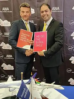 In 2019, AWA signed a Memorandum of Understanding with South African Airways to jointly pursue opportunities in West Africa, including a system-wide codeshare agreement and other commercial partnerships.[66] The codeshare went into effect in October 2019.[67]