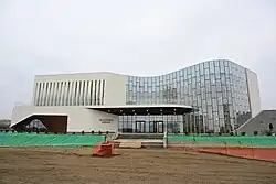 Prior to the war, the city had bus and tram lines and an airport which no longer function.[71] In November 2020, Azerbaijan Railways announced that it was discussing plans to build a 104 km railway line from Yevlakh to Stepanakert via Aghdam.[72] On May 10th, 2025, president of the Republic of Azerbaijan Ilham Aliyev visited the newly built Aghdam Railway and Bus Terminal Complex for its inauguration.[73] The railway station is expected to see between 800 and 1,000 passengers a day, while the Bus Terminal will serve 1,300 to 1,500 passengers a day. After the inauguration, the first train departed the station on the Barda-Aghdam Railway line.