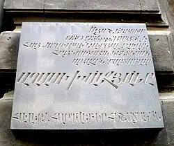 Soon after Khanjian's death, Beria promoted his loyalists Amatuni Amatuni as Armenian First Secretary and Khachik Mughdusi as chief of the Armenian NKVD. According to Amatuni in a June 1937 letter to Stalin, 1,365 people were arrested in the ten months after the death of Khanjian, among them 900 "Dashnak-Trotskiites."[14] Along with an entire generation of Soviet Armenian intellectual leaders, Khanjian was denounced as an "enemy of the people" during Stalin's Great Purge.[1] Charents viewed Khanjian's death "at the hands of Beria as an ominous sign of the violence to come."[11] The poet subsequently wrote a series of seven sonnets in memory of Khanjian, titled Dofinë nairakan: yot’ sonet Aghasi Khanjyanin (The Dauphin of Nairi: Seven Sonnets to Aghasi Khanjian).[9] Charents was eventually arrested on July 27, 1937 and died in prison on November 27.[15]