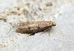 The wingspan of this moth is about 20 mm; its forewing coloration is a quite drab light taupe, mottled with slightly darker tiny specks. The head is covered in orange-yellow hairs.[7] Antennae reach about ¾ length of the long forewings, that are held in shallow roof-shaped position.[8] Dorsal surface of the abdomen has very narrow scales.[9]