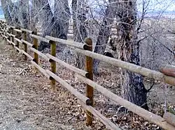 In other areas, fences were constructed of timber. Log fences or split-rail fences were simple fences constructed in newly cleared areas by stacking log rails. Earth could also be used as a fence; an example was what is now called the sunken fence, or "ha-ha," a type of wall built by digging a ditch with one steep side (which animals cannot scale) and one sloped side (where the animals roam).