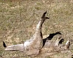 A kangaroo trapped in ringlock or "sheep" fencing.