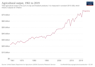 Argentine agriculture is relatively capital intensive, providing about 7% of all employment as of 2013,[1] and, even during its period of dominance around 1900, accounting for no more than a third of all labor.[2] Having accounted for nearly 20% of GDP as late as 1959, it adds, directly, less than 10% today.[1]