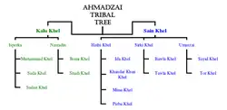 The Ahmedzai, whose name is translated as "descendants of Ahmad", are a distinct tribe from the similarly named community of Afghanistan.[1][2] They form one of the two major branches of the Wazir tribe, with the other being the Utmanzai of North Waziristan Agency, Pakistan.[3][4] The common ancestor of the Ahmadzai and Utmanzai is Wazir, who is also ancestor to the Mehsuds who have since taken a distinct and divergent path. Through Wazir, the tribes trace their origins to Karlanri and thence to the founder of the Pashtun lineage, Qais Abdur Rashid.[5] Ahmad was a son of Wazir.[1]