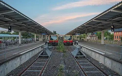 Ahrensfelde station is a station serving regional and S-Bahn services in the Berlin borough of Marzahn-Hellersdorf. It is located on the border of Berlin just outside the municipality of Ahrensfelde, which is in the state of Brandenburg. The station has three platform edges, one side platform for the S-Bahn, and an island platform for Regionalbahn and S-Bahn services.