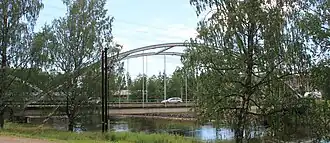 The Finnish national road 7 runs by Ahvenkoski as a part of the European route E18 highway. The highway was rerouted in the 1960s,[2] and the modern four-lane motorway was opened in 2013–2014.[6] The 1928 completed Savukoski Bridge, replacing the one destroyed in the 1918 Civil War, is today a tourist attraction, holding a status of a museum bridge.[2]