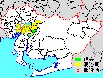 Following the Meiji Restoration, in 1871, former Owari Domain was renamed Nagoya Prefecture. However, for reasons still unclear, the name was changed to Aichi Prefecture. With the formal establishment of the municipality system on October 1, 1887, the modern Aichi District was established, with two towns (Atsuta and Narumi) and 46 villages. Yobitsugi was raised to town status on July 12, 1897, followed by Chikusa on February 13, 1902, and Aichi on December 10, 1904. In a major cadastral reorganization in 1906–1907, the number of remaining villages was reduced from 41 to 16, and the town of Atsuta was annexed by the city of Nagoya. The town of Shimonoisshiki was created on July 6, 1917. In another cadastral reform in 1921, the number of villages was reduced from 16 to 7, with the towns of Aichi and Yobitsugi annexed by Nagoya. The city of Nagoya further annexed Shimonoisshiki in March 1937, leaving the district with one town and 7 villages at the eve of World War II.