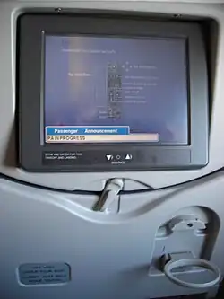 Seats may be equipped with power ports (either EmPower, AC, DC, or USB power-only sockets) for small electrical appliances and ports for headphones for the audio entertainment. Most full service airlines also include personal video screens as part of the in-flight entertainment system on long-haul aircraft - but some aircraft use a bring-your-own-device system where passengers use their own devices. The screens are often touchscreens or can be controlled by remote handsets. In economy and premium economy the screen is normally in a seatback, but in a front row seat or premium cabin they may need to be pulled out from a special compartment after takeoff, and then returned there for landing.