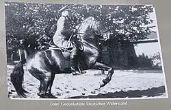 There is a popular conception that these movements were originally taught to horses for military purposes, and indeed both the Spanish Riding School and the Cadre Noir are military foundations. However, while agility was necessary on the battlefield, most of the airs as performed today would have exposed the vulnerable underbelly of the horse to the weapons of foot soldiers.[2] It is therefore more likely that the airs were exercises to develop the military horse and rider, rather than to be employed in combat.