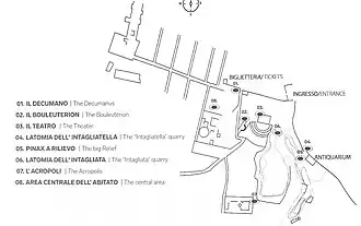 Excavations have revealed a theatre which is relatively small but very well reconstructed. On the flat area above Intagliata are the foundation stones of the Aphrodision, the temple of Aphrodite, erected in the mid-6th century BC. At the western end of the site is the Bouleuterion, where the city council met. East of the hill are the Feral Temples, dedicated to the cult of the dead.